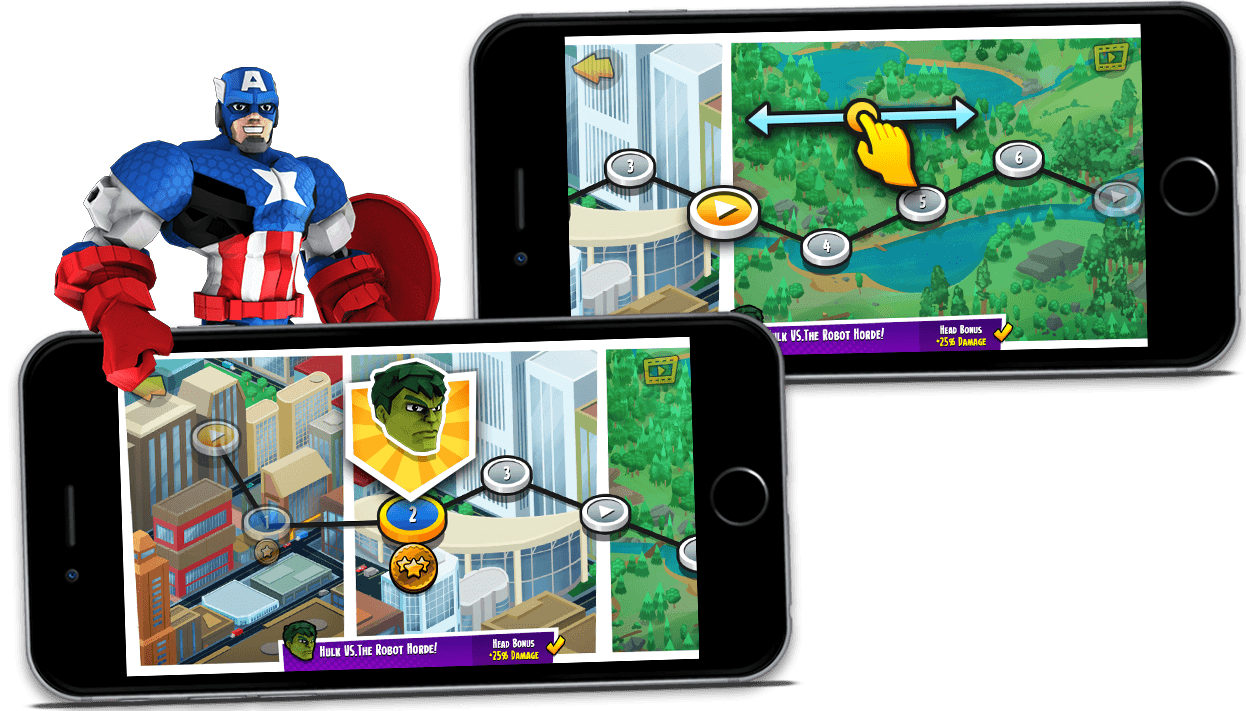 Mash-up, battle and smash-up! Protect the planet from hordes of villains with your favorite Marvel Super Heroes! Harness the power of Hulk, Groot, Captain America, Spider-Man and Iron Man and save the day. Blend heroes’ looks, powers and abilities in the MixLab to create the ultimate champion! Trigger mighty special moves in Smash Mode!